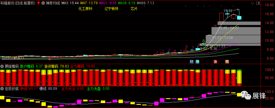 科隆股份是今天前市临收盘前的起爆牛股预警,我曾犹豫是不是要买入,毕竟短期有些高,看了一下资金流之后,我决定在3日均线附近进行买入,用高抛做T的钱,没想到该股在15.88元挣扎了一下,便一路下行,我没有在盘中进行加仓,因为明天还要看7日线能不能撑,如果万一不对的话,也有止损的余地,毕竟主力筹码下降过快,但资金仅有-2119万净流出!