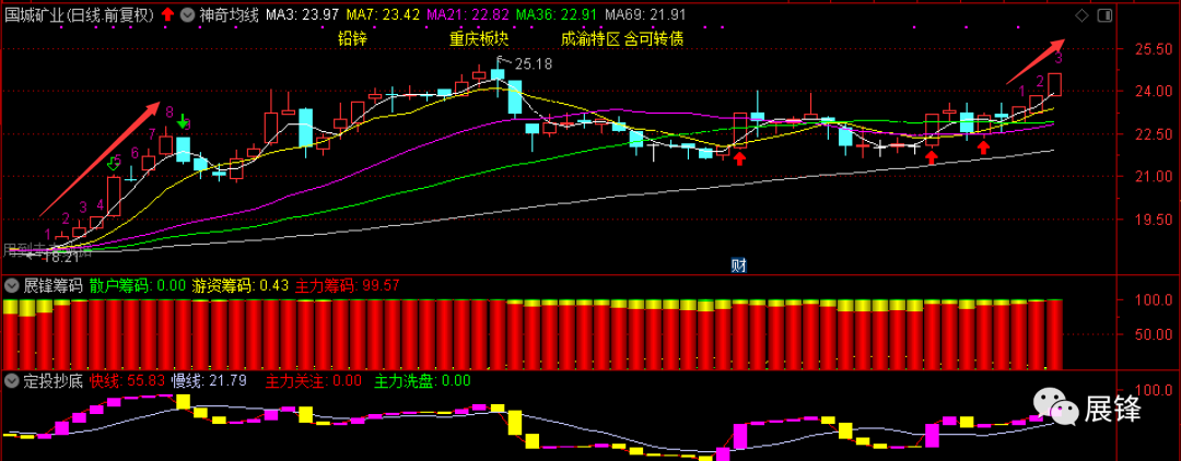 “老情人”国城矿业,今天走势不错,小上涨周期进入第3天,如果按前面的走势看,走到第8天时高抛比较合适,完全是老派庄股的走法,我初步测算了一下,上涨压力在25.90和26.48元,26.48元应该是w底的亮度升幅位置,如果没有意外情况的话,这些都不是太大的问题,走一步看一步吧,等利润再丰厚一些,再考虑是不是逢高减仓!