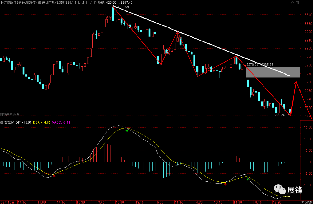 午后直播的时候,我讲到了明天会有一个反弹出现,不管击不击穿3220,从15分钟背离线来看,这个小反弹都是要有的,今天下降压力收在3267.43,下行速率是每15分钟1.32个点,以此类推,你就可以计算出反弹的大致位置附近,再次向下击穿3202或3174后,市场才会迎来一个新的变化,这是一个最基本的研判,仅供技术派股友摸索!