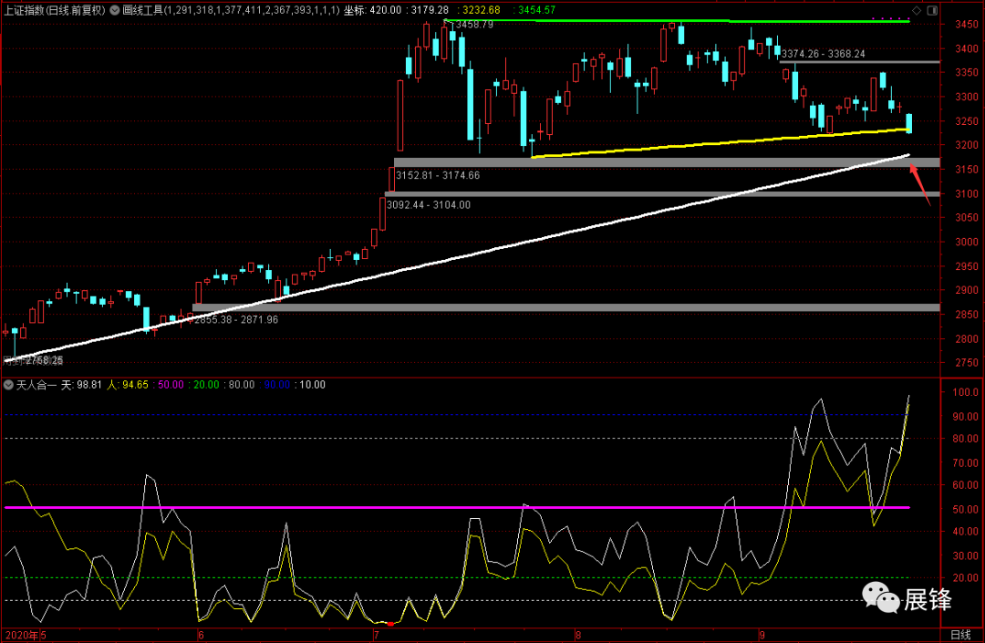 今天沪指收盘跌破了3232.68的支撑位,下档上升趋势线收在3179.28,明天该线上升至3183.41,从天人合一指标人线数值94.65来看,短期市场已经进入极度超卖,距离我期待的跌穿3174点虽然已经不远,但这里肯定会做一个小的反抽后,再向下去考验或击穿3174,具体的画线我会在今晚讲课中展示,有兴趣的可以届时来听一听!
