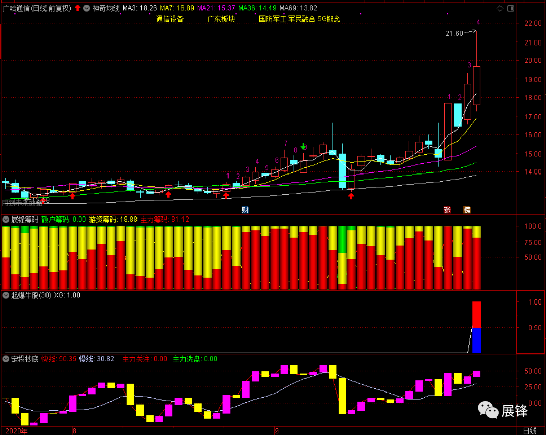 起爆牛股,今天18.24元预警了广哈通信,这股盘中最高冲到了21.60元,我把它作为红包股进行了第1波推送,买到的股友自然欢喜的不得了!其实这里也透露出一个起爆牛股的新用法,当预警发出之后,观察主图TD数值,只要是在1~5之间,就可以考虑立即或逢低买入,大不了回落到7日线再加两成仓位,就算信号消失了也无妨,次日高抛即可!明天我们将迎来双节,最后祝大家双节愉快!万事如意!