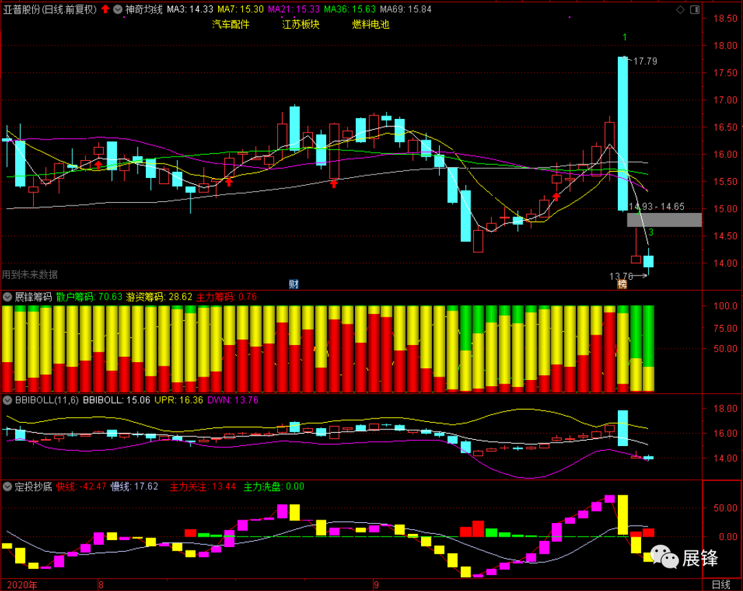 午后13.77元,我买入了亚普股份,旗舰版用户都觉得很奇怪,怎么还能这么买呢?其实该股昨天就有定投抄底买入信号和破布林下轨,我今天在13.77元买,已经低于昨日收盘价,如果今天收盘低于13.77元向下超过-1%的话,那我就再加一次仓好了,这和昨天买入没什么区别,但实际持仓成本会降低一些,结果该股收盘13.91元,我还占了一个点的便宜!定头抄底选股买入法,最近好多股友都用的如鱼得水,特别是在如此弱势的环境下,我也敢说,这是我在2020年最伟大的创举之一,它开了逢低买入、稳健获利的先河,现在年版虽然1024元了,但依旧得到了很多股友的追捧,今年双节假期,这个指标我再出50份,然后就彻底不再拿出来分享了,想动手的就抓紧,不想要的就直接飘过!