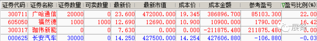 珈伟新能今天开盘做了高抛获利了结,虽然才有21万多的盈利,但总算给国诚矿业减亏做了点儿贡献,每个账户上买了2~3万股的广哈通信,收盘有+22%的收益,尾盘买了长安汽车3万股,根据金牛回头操作系统买入的,属于筹码符合后上涨第1天,好的话还有个6~8天可以涨,但能够涨到哪里去?就只能走一步看一步了,希望有一个好的结果吧!