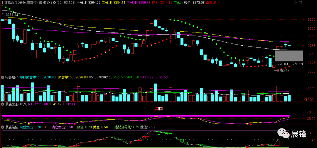 A股今天随之大幅高开,盘中最高冲到3280.51,我给出的压力带是3282~3284,大概也就是60分钟二号线的位置,结果大家也看到了,并没有向上形成突破,反而尾盘有所回落,说明什么呢?很简单,3282~3284这个压力带如果突破站稳,A股会结束调整走一波上扬,否则压力带附近,可能是高抛的好位置!