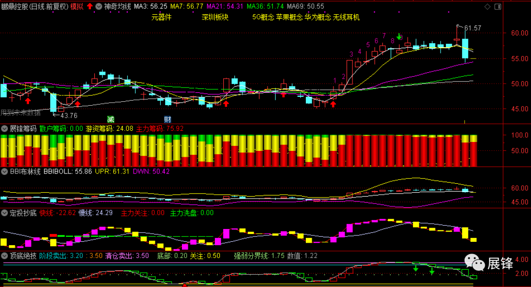 有股友咨询鹏鼎控股如何操作?这个股票今天短期有+3%以上收益,如果贪了没有获利出局的话,只能到21日线附近再考虑加仓,并且要以21日均线为标尺,不破就继续持有,3~5%或以上继续自由止盈。如果21日均线被破而无法收回,就要趁反抽,先逢高出来!感冒还没有好,今天就不多写了,我还是那句话,没点儿技术就别在这市场里混,心理承受能力不行的,也趁早离开这个市场,就这!