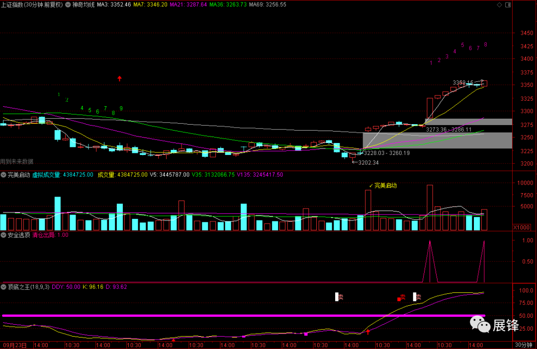 今天是节后第2个交易日,开盘第1个30分钟,其实有一个安全逃顶信号,通过观察顶底之王,发现这个信号没什么问题;临近收盘的时候,30分钟又出现了一个安全逃顶信号,这个信号发生在特高位,所以按道理讲,尾盘进行一下高抛,原则是没有问题的。创业板亦是如此,经过连续两个交易日大涨,市场积累了相当的获利盘,抛掉后等回档逢低再考虑买入!