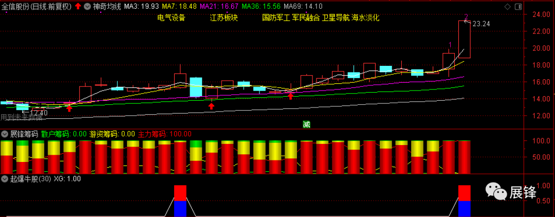 全信股份是今天起爆牛股中最靓的仔,20.26元预警的时候,我就已经注意上了它,为什么要注意它呢?其实很简单,起爆牛股选股系统的一个应用逻辑,就是信号发出后看主图TD序列数字,以全信股份为例,今天它刚刚是数字2,具备短线继续活跃的时间和空间,所以预警发出后,有大把的时间逢低积极吸纳,结果大家都看到,靓仔就是靓仔!