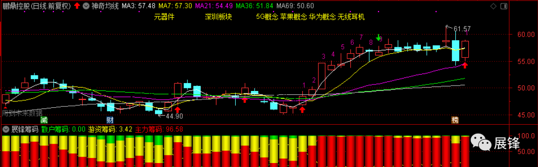 昨天点评过的鹏鼎控股,今天本身上来涨幅将近7%,主力筹码96.58,日k线下出现红箭头买入信号,上面出现TD上涨序列1,如果能够稳定住的话,那么短期该股开启一波上涨也不是不可能,只要不经历其他意外的变故,这种可能性都是存在的,可以纳入自选股做观察,就当学习一种操作模式,对今后的股票操作很有好处的!