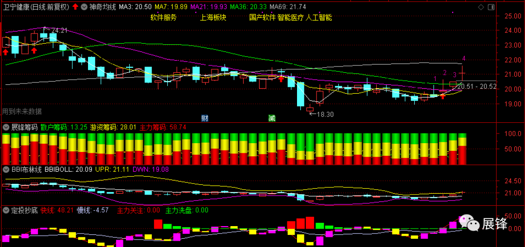 卫宁健康最近走势,似乎总是差那么一口气。子公司引入战投京东健康与药明康德,有利于优化卫宁科技股东结构,增强卫宁科技的资金实力,扩大经营规模,助推卫宁科技在医保控费领域的市场地位和经营业绩,使其成为业内龙头企业,实现各方利益最大化。技术面上,该股今天是日线级别上涨第4天,短期压力在69日均线21.74元附近!今天不多写了,晚上在一直播有一堂重要的讲课,有兴趣的到时候过来听听,主要是讲神奇均线和其他指标的结合用法,从技术角度的研判手段,深入剖析TD序列中的奥妙,以及简单的运用方法!