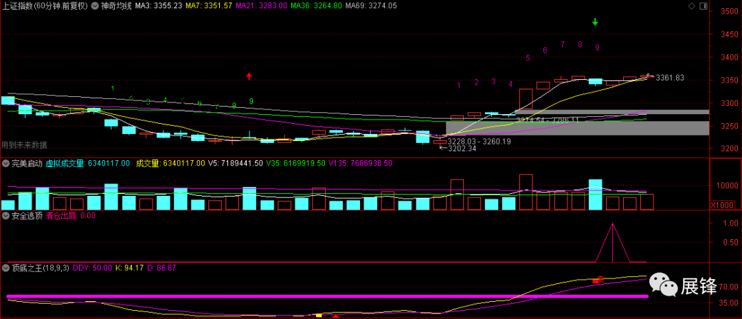 继昨日市场30分钟出现安全逃顶信号后,今天60分钟又都相继出现了安全逃顶信号,这是对超短线和短线投资者而言的。虽然今天沪指30分钟顶底之王在高位再度金叉,但短期若想真正突破的话,需要释放出更大的量能,否则很容易出现冲高回落,短期而言,大盘震荡或调整可能增大,所以操作上,尽量以快进快出为主,60分钟顶底之王如死叉,调整必至!