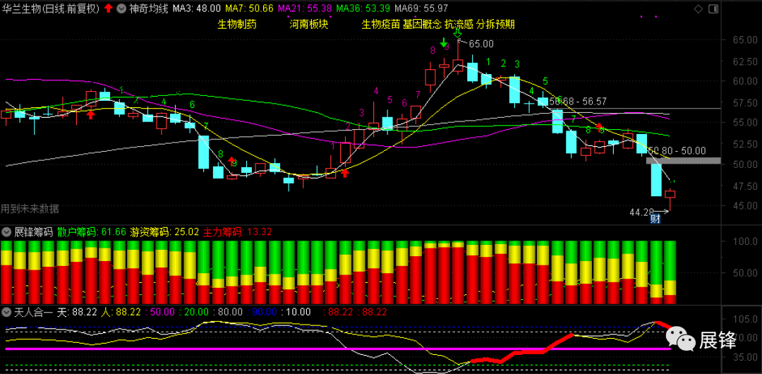 华兰生物今天探底回升,昨天我讲过了,该股日线天人合一的天线和人线数值昨天都是100,二线合二为一后,所产生的方向也将形成合力,最近机构杀估值比较厉害,华兰生物也未能幸免,但该股的业绩及题材,是当下市场最好的,使劲往下打压的目的,无非是想拿到更多的筹码,你怎么看?欢迎留言一起探讨!今天就暂时写到这里,有些话不能说,有些话也不能多说,如果你在这个市场里,想要好好的生存下去,而且拿到相对稳定的收获,我建议你多学一点股市技术,如果你只是想混一混,我建议你早点离开这个市场,因为它太不公平,早晚有一天会让你血本无归,听我一句劝,就这!