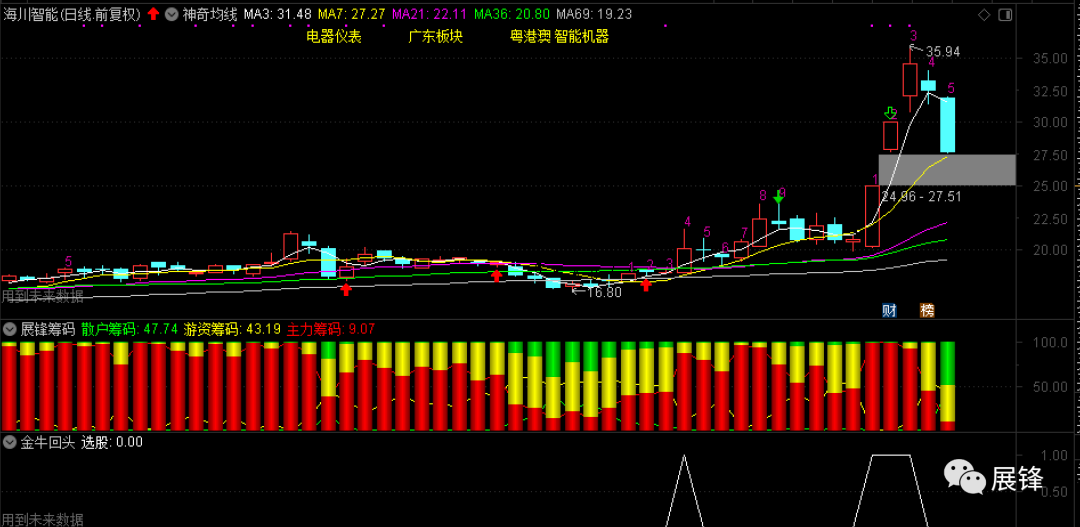 昨天在3日均线32.23元买了点海川智能,当时是起爆牛股预警,没想到今天向下折了这么大一个跟头,本来在27.27元准备加两成仓位的,结果发现也没有到,所以后来就没有挂单。收盘我测算了一下,明天的支撑位在26.67元,我打算在这个价位附近搞两成仓位进来,摊低一下高企的成本,如果盘中有机会能做T的话,我就先T一脚昨天的筹码,没什么大不了!可能有人会问我,如果错了那怎么办?其实你要做短线,你就盯住7日均线就好,7日均线如果跌破无法收回,在股价反抽的时候,你就在7日均线附近止损就好了,别想那么多没用的,你我都不是神仙,谁没有犯错的时候呢?利用个人技术,就是大概率的规避风险,但遇上风险之后,千万不要手忙脚乱,不是你的就不是你,是你的永远跑不了!我就不多说了,今天暂时写到这,晚上在一直播还是有讲课的,如果你有兴趣的话,就过来听一听,炒股必须学点技术,一点技术都没有,除非你们家有矿,你愿意把你自己的钱拿到这里砸鸭脑袋,自己好好思考一下!