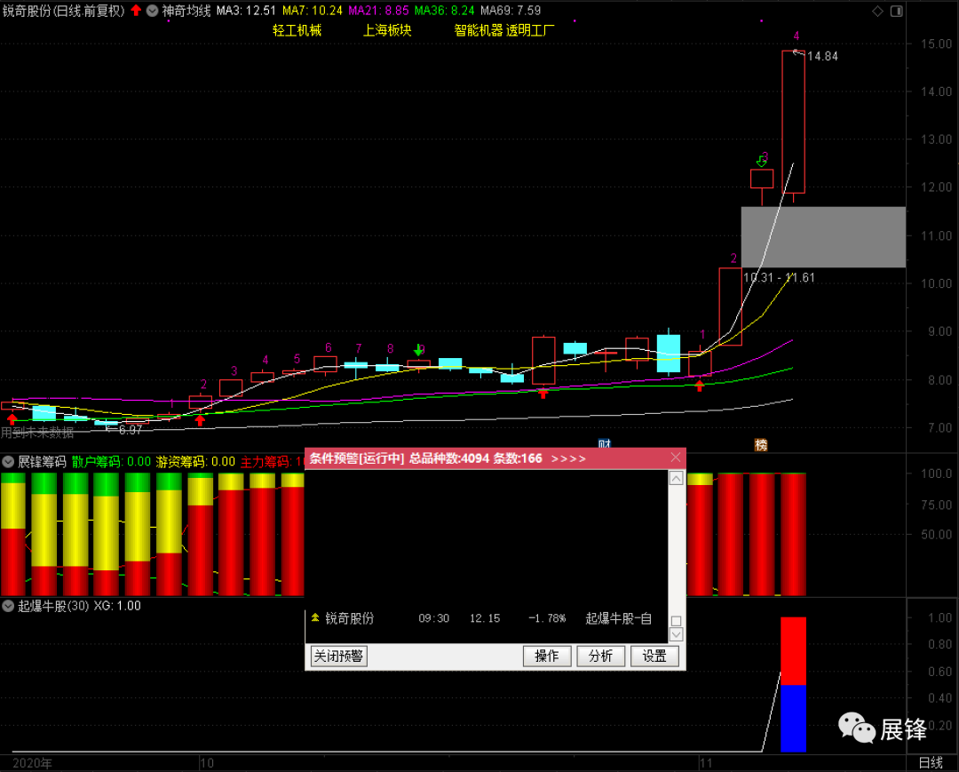 锐奇股份是今天起爆牛股预警,预定价格12.15元,最终该股封死涨停,成为今日起爆牛股中最靓的仔,前面讲课时多次说过,但预警信号发出后,立即看主图TD标注的数字,哪怕是1~4都没问题,逢低买入的话,如果股价杀下来,就在7日均线附近加两成仓位,如果股价直接涨上去,也不丢任何的仓位,这是个进可攻,退可守的好办法!