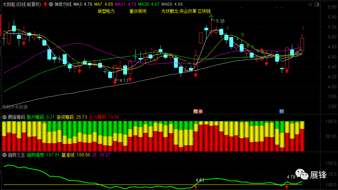 趋势之王本周二预警的太阳能,今天表现非常不错,从日线级别来看,它是TD上涨第2天,盘中最高冲到5.07元,早盘在抖音直播的时候我讲过,突破4.82元的,这支个股不排除会冲涨停板,而下午没有稳定在5.03元,所以最终没有冲击涨停,接下来,特别注意一下5.18元这个重要的压力位,只有这个位置有效突破,该股才会有大展宏图的机会!