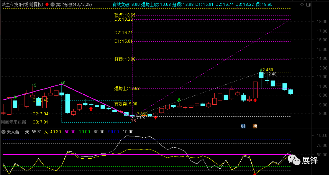 然后有股友咨询派生科技如何操作?我用卖出预测做了一个结构划分,该股今天跌破强势上涨位10.68元,短期支撑在9.43和9元附近,从天人合一指标人线表现看,人线数值49.39,还没有完全突破50数值,也就是说,如果明天人线拐头下破,那么该股将迎来反弹走势,如果10.68元能再度收复站稳的话,该股后期或将有机会挑战13.88或15.81阻力位!