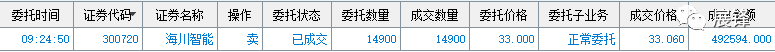 早盘集合竞价卖出300720海川智能,成交价格33.06元,我的整体获利超过+12.49%,该股最高冲到34.64元,但对此我并不感冒,手中的持仓甚多,一点点儿股票并不会对整体利润产生太大影响,但此类个股只要按照规矩来做,通常被套都是暂时的,什么规矩呢?1+2建仓法,不管你第1笔买的多高,第二笔加入两倍的力量摊低成本,赚钱就是大概率事件!