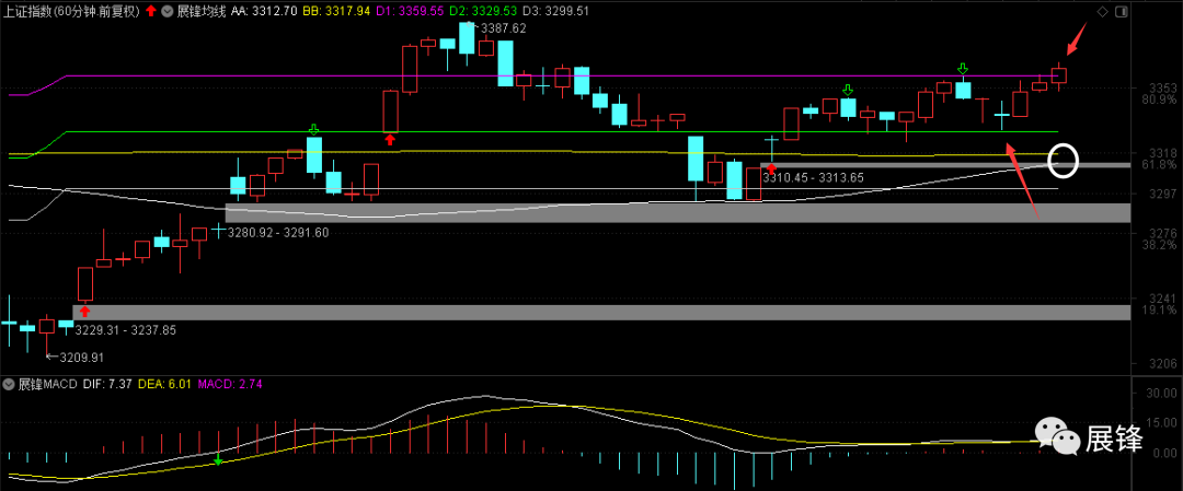今天沪指60分钟收盘突破了3359.55,最后那只black手还是那么油滑,给你的感觉就是一切尽在掌握中!第1小时的迅速下杀3330,你看图上的D2在3329.53,四舍五入其实也是3330,有这么巧合吗?只能说是控制的好,你说呢?今天没有继续上行,只是对3359.55进行的突破,60分钟AA和BB线还没有交叉,推演了一下,明天最后一个小时可能交叉!
