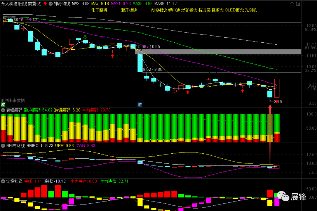 上一个交易日定投抄底,我们买入的是永太科技。介入价位是8.63元,不管从哪个角度出发,谁也看不出来今天它会出现涨停板。按照实际操作原则来做,8.63×1.04=8.97元,你今天只要把股票挂在8.97元,就完全可以成交。有的人等到了涨停板,说实话我个人也不羡慕,因为定投抄底的卖出操作原则不是这样,赚你自己该赚的钱,这样很重要!