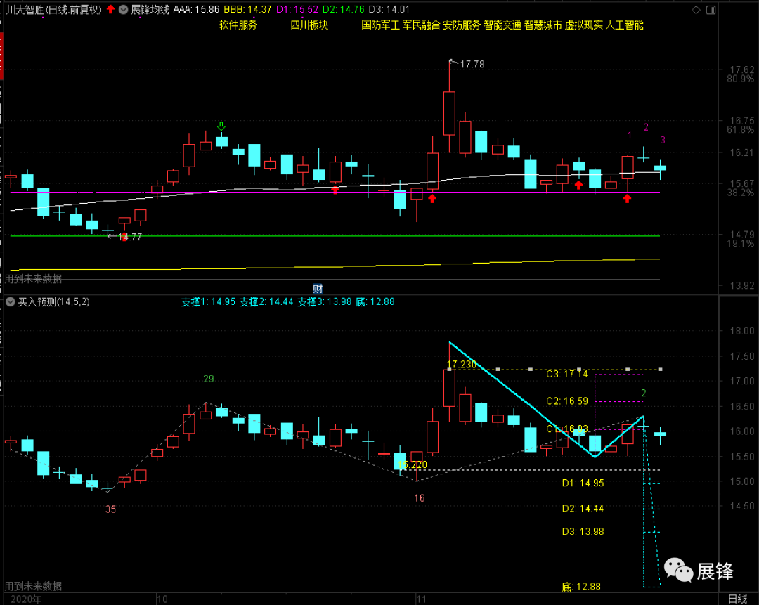 今天盘中发现一只个股川大智胜,拿出来和大家一起探讨交流一下。该股日线级别,小周期上涨第三天,今天回调踩AA线15.86元。从附图结构买入预测来看,其反弹压力位16.03元,如果能够突破站稳的话,可以看到16.59或17.14元。不知道广大股友有何看法?欢迎文后交流探讨~~今天我就不多写了,20点的时候我会在一直播做讲课。有兴趣的朋友可以过来听一下,就这!