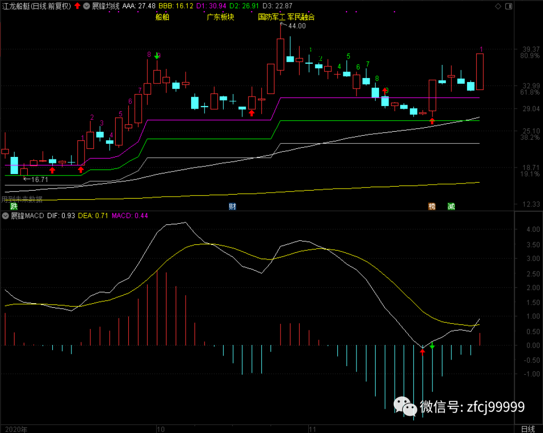 今天军工板块表现最好的就是江龙船艇,这只股票从日K线角度来看,算得上是最活跃的军工股之一。之前,我们曾多次在该股中进出,昨天AA线上传穿D2线,构成极佳的短线买点,今天就揭开而且封上涨停板,多多少少让人有些猝不及防。同时,也说明该股主力一直运作其中,未来可能还会有更好的表现,我们不妨把它加到自选股中进一步观察!