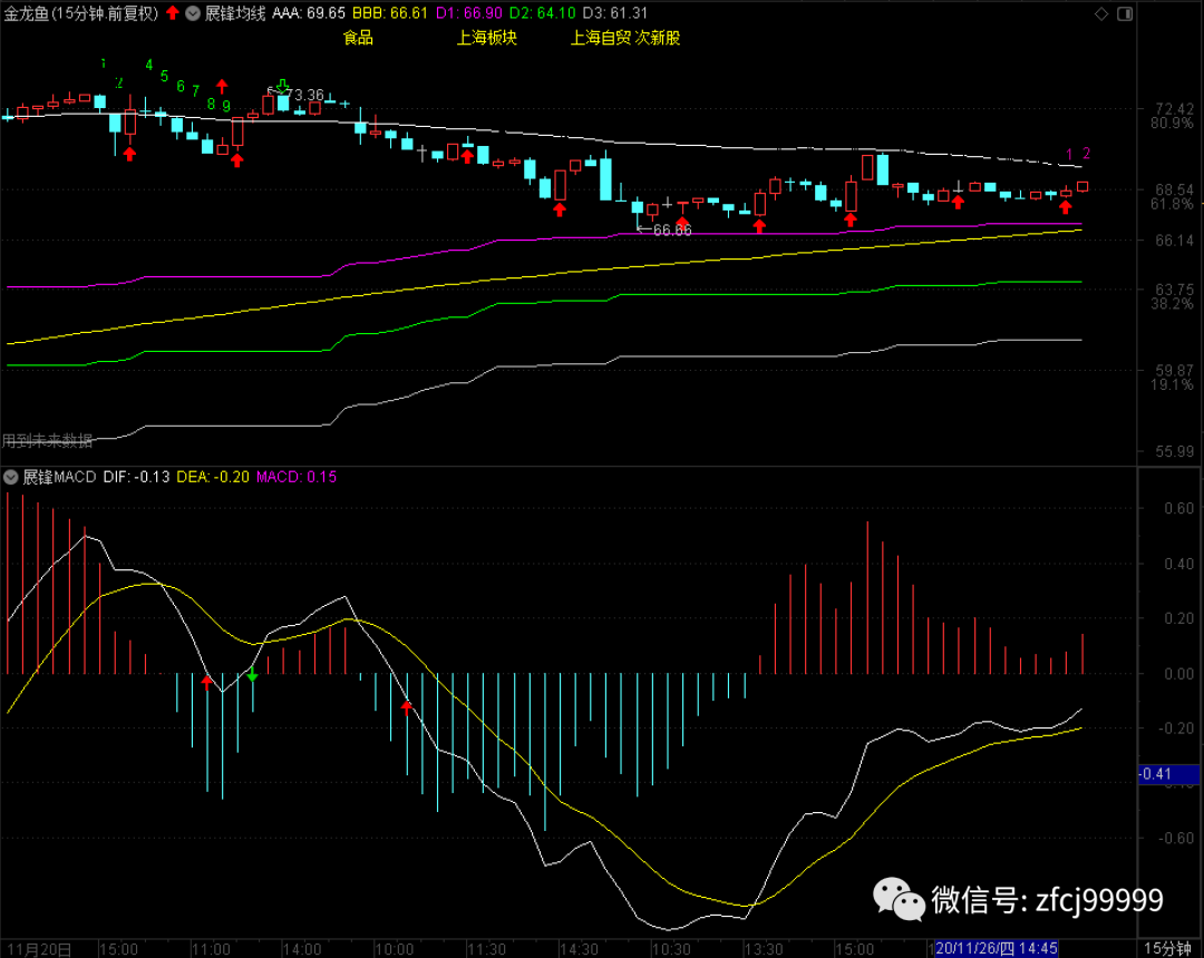今天69.69元将加仓的金龙鱼高抛出局,该股是昨日66.66元加仓买入的,盘中直播的时候喊过很多次,从15分钟的形态来看,注意短期白色线上穿零轴之后的走势,如果有快速的向上拉升的话,可以根据当时实际情况,做是否了结的处理。否则就耐心持有,等待日线级别调整的结束,个人角度来看,该股还没有做完,应该具备一定的机会!