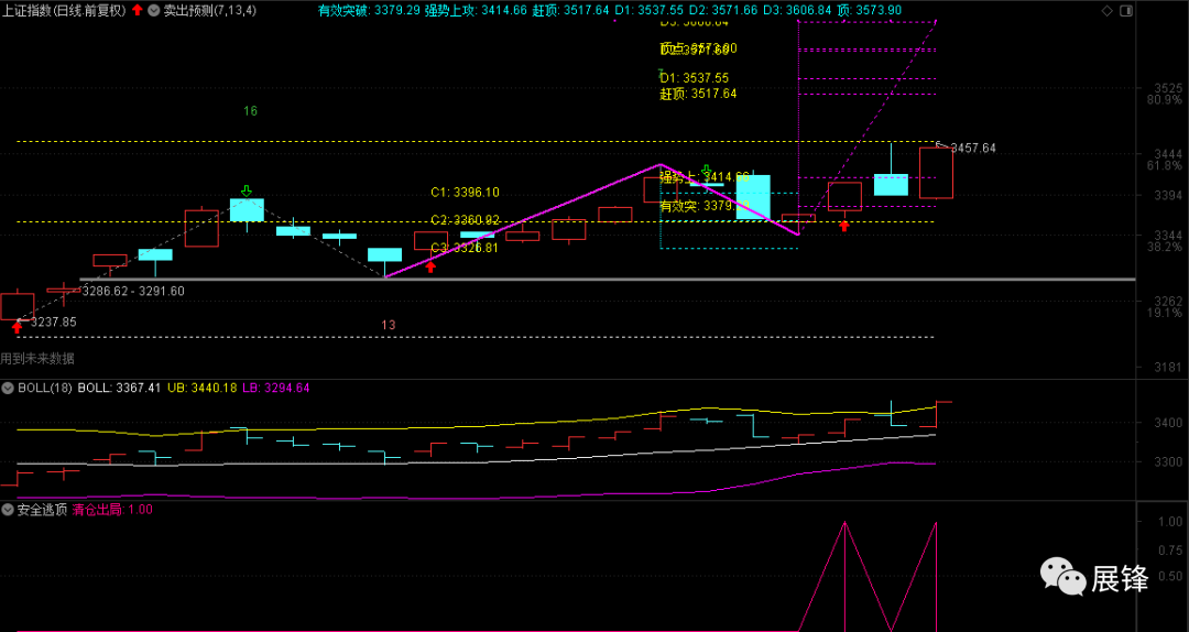 今天上证50指数又出现了一个安全逃顶信号,这是带动上证指数回升的最主要因素,收盘后上证指数也有一个安全逃顶信号确立。从这个信号的定义来看,如果今天不是见顶的话,那么接下来两个交易日,将有重要的高抛机会出现。毕竟日线布林线中轨已经被再次突破,3452.66是明天布林线中轨位置附近,这个位置要特别的注意!今天沪指最高冲到3457.64点,距离3458.79也就1.15点,有谁能控制这么好呢?我不讲,你也是心知肚明的!所以从我个人角度讲,市场迟迟不做任何的表态,让很多朋友开始有些迷茫。短线而言,追也不是,不追也不是!以后遇到这种选择的时候,你只要选择将获利较大的品种做减法即可。因为在A股这个不健康的市场里,不赚钱没毛病,如果亏钱就很闹心了!