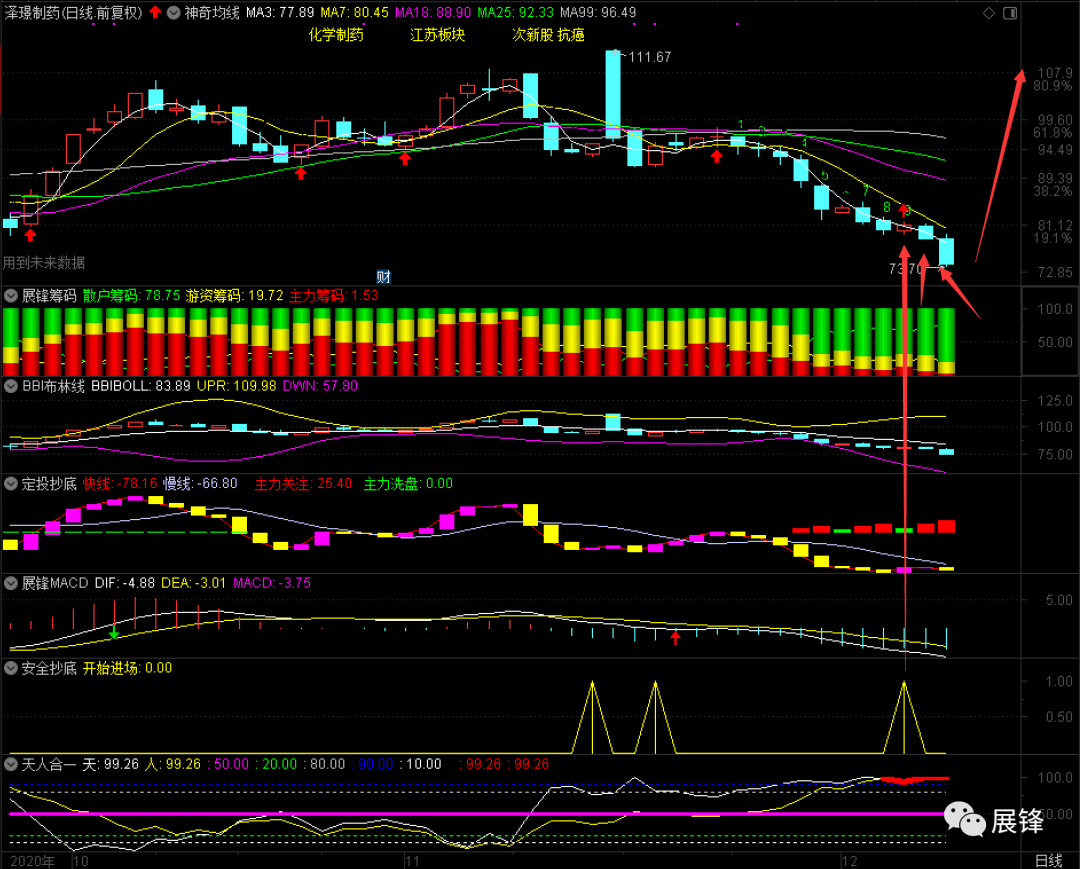 最后,我来解答一位投资者朋友的疑惑:688266泽璟制药!该股基本面我们暂且不论,单就技术面而言,上周五该股出现了安全抄底信号,天人合一天线和人线都在99.26,按照设计原则,昨天和今天是逢低分批吸纳的最好机会,虽然主力筹码目前只有1.53,但我觉得这只个股和其他的医药股不同,今天形成底部区域的概率很大,我们不妨一起边走边看!