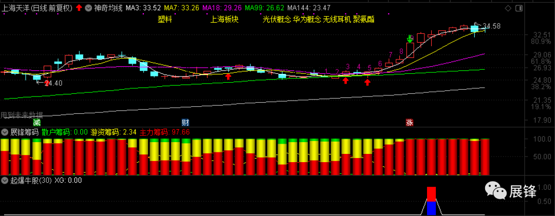 昨天32.92元买入的上海天洋,今天在33.70元做了高抛。可能有人觉得,主力筹码97.66,应该可以再等等看。其实这只个股,我是按照起爆牛股预警后,首次回踩7天线买入的,今天没有太大的作为,短期高抛一下也无妨,毕竟不是亏着抛的,所以明天就算涨停或者怎么样也不后悔,毕竟个股目前基本上都是如履薄冰!
