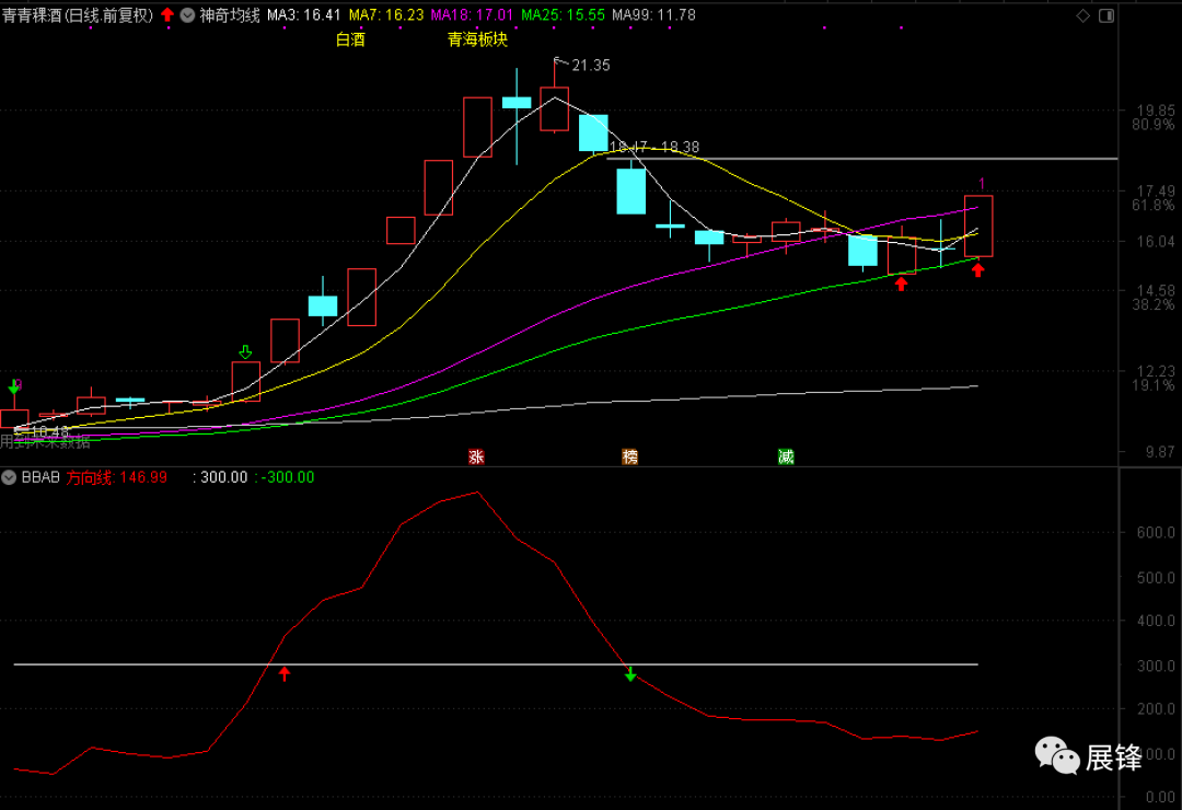 这两天我一直在盯着青青喝酒,结果还是盯飞了......该股11月12日有超级强势信号,11月30日首次回调落回18日均线15.57元,曾经有过超过+6%的反弹。而后跌穿18日均线,再度企稳后今天冲涨停板,这关乎着我另一种操作模式的界定,目前来看,短期18和25日均线,效果看上去相对理想。所以接下来,我们再看一段儿,然后再进行规则的建立。