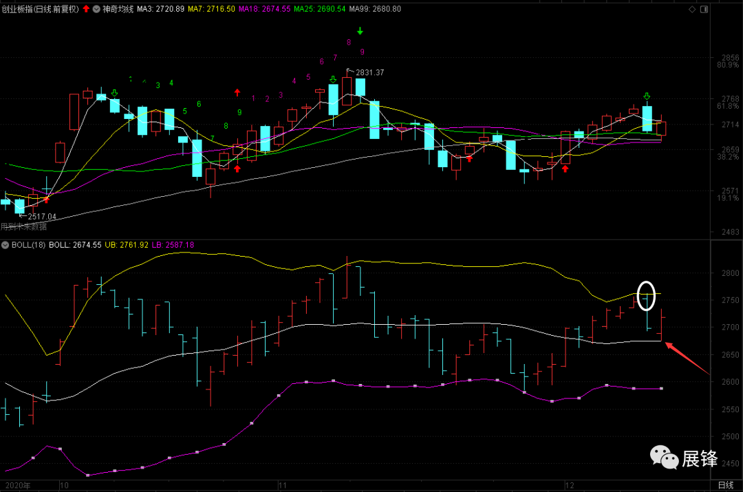 昨天创业板指打布林上轨引发整个市场出现调整,今天回调到布林中轨企稳回升,带动上证指数最终收红盘,但由于沪指的反弹力度,连25日均线都没有收获,所以接下来创业板指如果打布林上轨2761附近的话,应该会引发沪指的又一次下跌。而此时3344的28最好被跌穿,哪怕再向下面打到3330~3325,把沪指的日线结构走完整,才有利于接下来的反弹!这几天我一直在强调创业板引发沪指共振的问题,到目前为止没有看到协同迹象。这是最差的一种预期了,如果在这个位置还拖拖拉拉的话,那么今年恐怕也就如此了。7月的一个快速拉升,换来了5个月的横盘震荡,谁最高兴呢?我不讲你也是心知肚明的,所以我依然认为,后市最为活跃的是以创业板为首的中小盘股,周期股不与之形成共振的话,会继续由强转弱!
