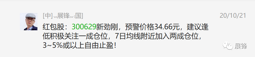 10月21日红包股分享了300629新金刚,按照操作计划34.66元买入1000股,次日7日线33.05元买入2000股。如此一来,平均成本就是33.59元,按照给定的止盈要求3~5%,10月27日最高34.88元,获利有+3.84%。这就是按要求来的结果。如果没有按要求自己止盈的话,到今天已经跌去了10元左右,但基于该股有涨停基因,所以短期调整后应该有机会回来!再多的东西我就不写了,今天晚上讲课的时候我会多说一些,有兴趣的朋友可以过来听听,今天特别要讲均线的一个设置,因为这样设置更有利于现在的这个盘局,暂时说到这儿!