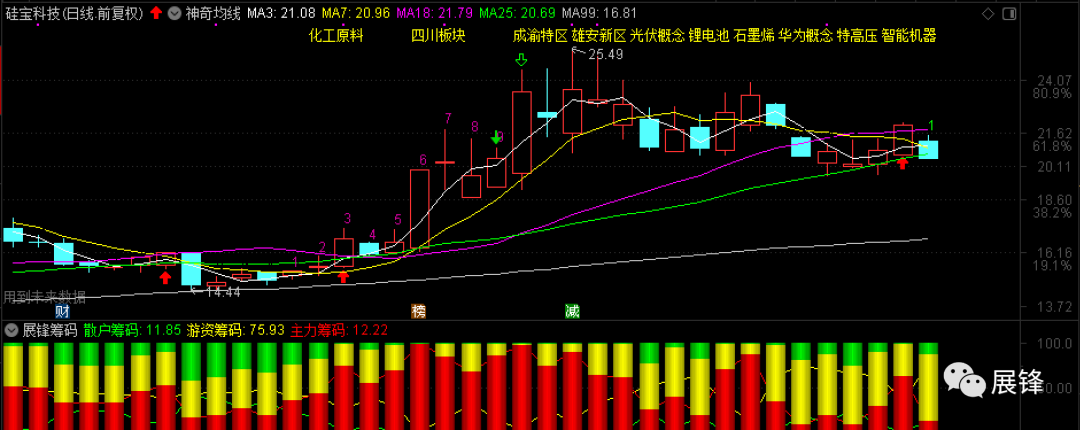昨天走势相对不错的硅宝科技,今天低开后向25日均线靠拢,当时25日均线在20.72元,原则上这里是可以加一定仓位的,因为加仓之后,如果站稳25日均线,一定会有一个不错的反弹出现。但实际情况是收盘25日均线被跌穿,那么接下来就要注意,如果接下来不能修复站稳25日均线的话,就要把加仓的这一部分沿着25日均线附近先抛出来。这也涉及到了一个策略的问题,以后凡是买入红包股的股友,我再一次重新操作要点:以硅宝科技为例,就算第一单你买在了最高价25.49元(1000股),也千万不要慌张,如果小操作计划规定你7日线买入2000股,你按要求执行就是了。盘中该股如果出现一定的反弹,你可以考虑将先前买入的1000股进行高抛,这样不但可以有效的降低成本,而且可以让持仓风险降低。如果我给出的小的操作计划25.49元买入1000股,25日线加买2000股。也就是说今天在20.72元加入了2000股,结果收盘跌破了25日均线。这时你可以选择这样做,接下来反抽,如果无法站上25日均线的话,就在25日均线附近出掉止损全部股票;或者在25日均线附近卖掉加仓部分。等待股票彻底企稳后,在相应位置再加仓2000股。具体今晚讲课我会说到!