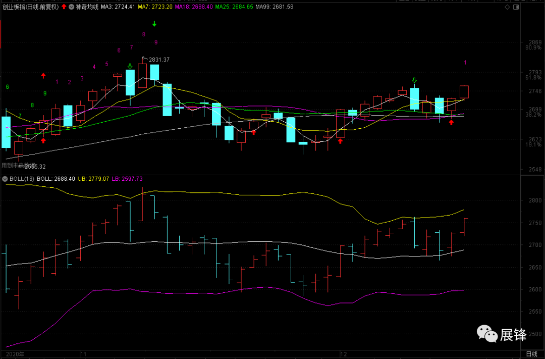 创业板今天突破了2759.52,日线级别不但完成了由空翻多,而且小周期TD出现了上1的标识,在这里不得不多说一句,创业板一直在布林箱体内做震荡,接下来可能面临上轨的反压,如果没有主板共振的配合,就算突破布林上轨,最后也一定会被压回来。如此一来,会带动整个市场出现回调。所以,接下来还是要特别小心!中小盘个股机会很多,把握好高抛低吸即可!