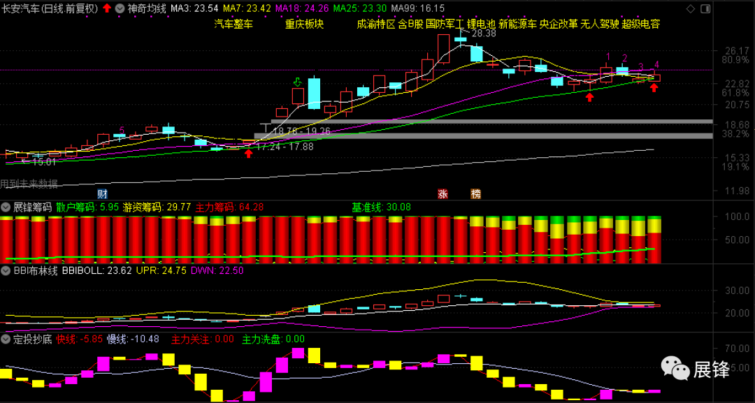 我今天纠结了很长时间长安汽车,初步定在18日均线24.24元附近挂单高抛,结果股价最高冲到24.23元。在分享操作时我让撤单了,因为我知道,如果不是为了有更大的作为,它盘旋在半空中几乎就没有意义。后来由结构分析发现,它真正的压力位在24.98元,所以一块多钱的利润我暂时没有要,等下个交易日,看看18日均线能否被突破,在决定股票的去留!