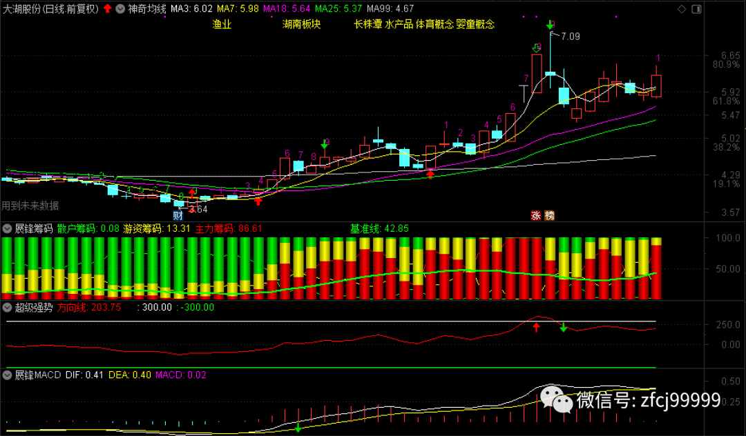 大湖股份今天最高冲到了6.45元附近,有持仓的用户做了高抛获利了结处理,下午我上来的比较晚,看看日线上出现了上涨TD1,所以我决定再看看再说。正常情况下,该股主力筹码超过了86.61,如果能一直保持下去的话,短期应该还是会大有作为的,明天看盘中情况再定去留吧!