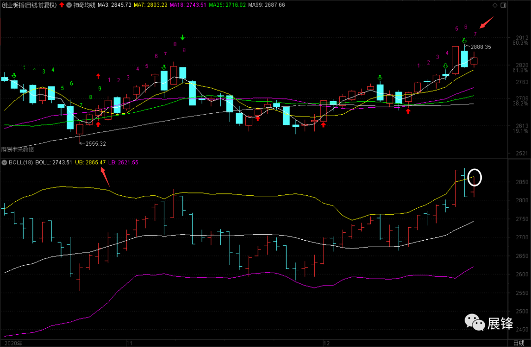 今天创业板指日线出现了安全逃顶信号,这是反弹级别上涨周期第7天,出现这样的情况,其实不外乎两种可能,一是今天就见到高点;二是明后两天上,冲后见高点。总之就是提示有风险了。此外,从布林线角度来看,今天创业板指最高2865.47,正好是布林上轨所在位置,可谓是分毫不差。所以,对于已经涨高了的个股,要特别注意做逢高减仓处理!