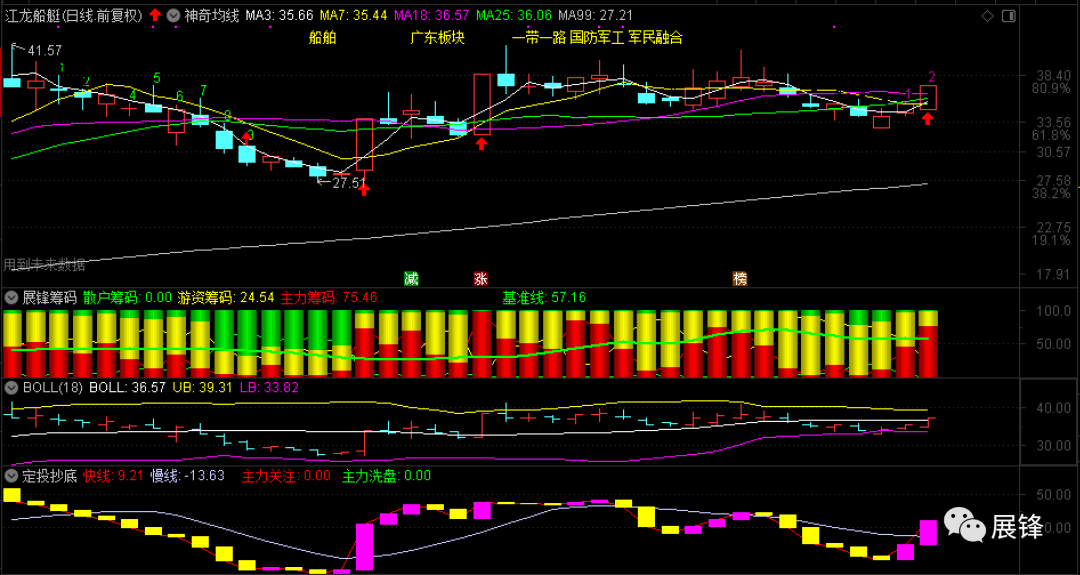 35.01元加仓的江龙船艇,今天盘中做了减仓处理,原有仓位保持不变,主要是觉得还没有涨到位,抛掉加仓的部分,只是为了让平均成本多降下来一些,这样才可以更加安心的持股。单就纯技术角度来看,这只个股短期压力位在39.31元附近,如果不是快速突破拉涨停的话,估计这个位置附近是可以做获利了结的!