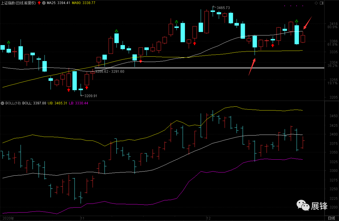 在昨天讲课的时候,我说到指数会有回抽25日均线的要求,25日均线在3394点,今天指数完成了一个标准的回抽。不管明天能不能收复25日均线,在这个回抽时做相应的高抛获利减仓,应该是没有任何问题的。当然,这并不是关键的所在,最关键的是12月11日低点点3325.17,这里绝对不允许跌破,否则接下来沪指或将迎来黑暗时刻!