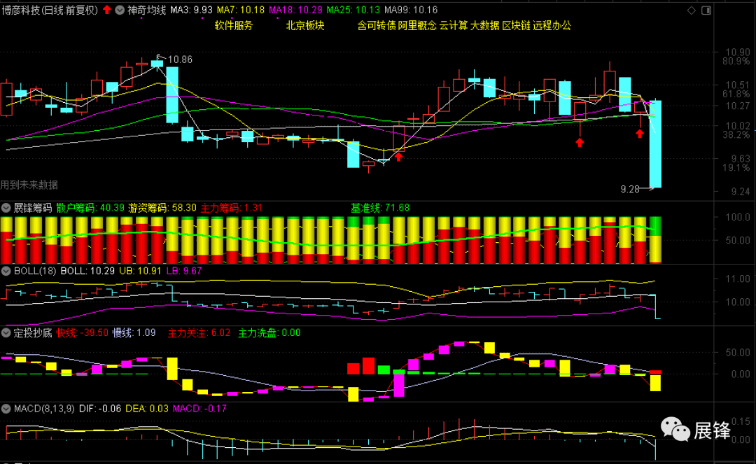 博彦科技今日的跌停让我有些猝不及防,明明昨天收盘已经站回了18日均线,但今天却突然出现如此之走势,真是有些无厘头!接下来,怎么办呢?应对这样的个股,切记一个大的原则,只要其基本面没有发生巨大变化,就耐心等待其回抽99或25日均线,因为重要的均线被突破或跌破后,都有一个回抽确认的过程,回头无法收复的时候再考虑逢高出局!
