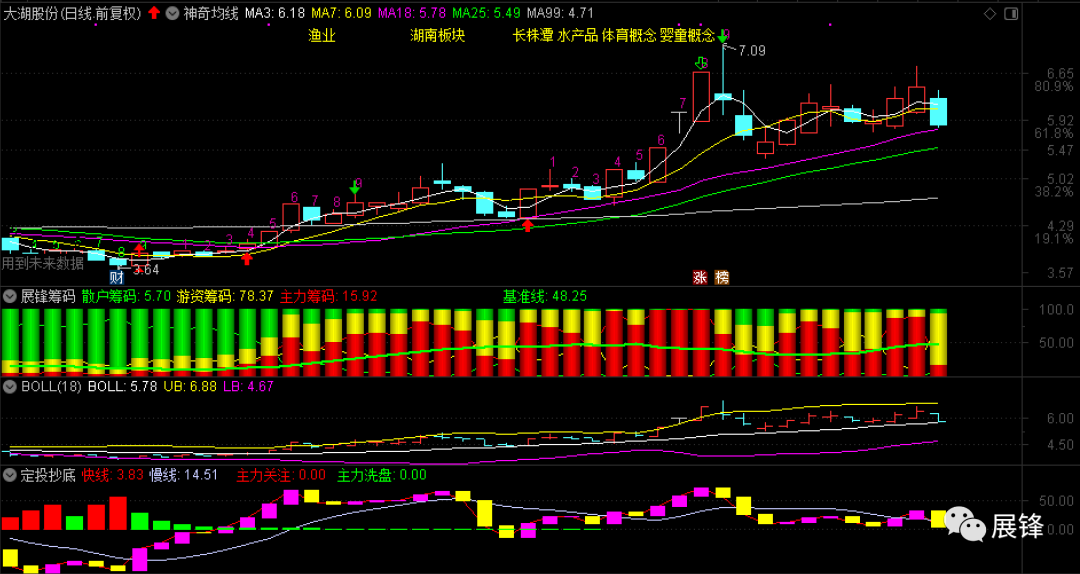 今天在5.80元加了两成仓位的大湖股份,盘中有冲高反弹机会,但并不符合我的获利预期,所以这个反弹T我没有做,它的一度跌停和酒类个股的下跌是有关系的。所以短期我并不太在乎,今天我还补仓了一个乳业股,效果不是太理想,我视其为第二的金龙鱼,可能主力把我当成了傻瓜,不过没有关系,按照原则来操作就行了,25日线跌破,总该反抽一下吧?