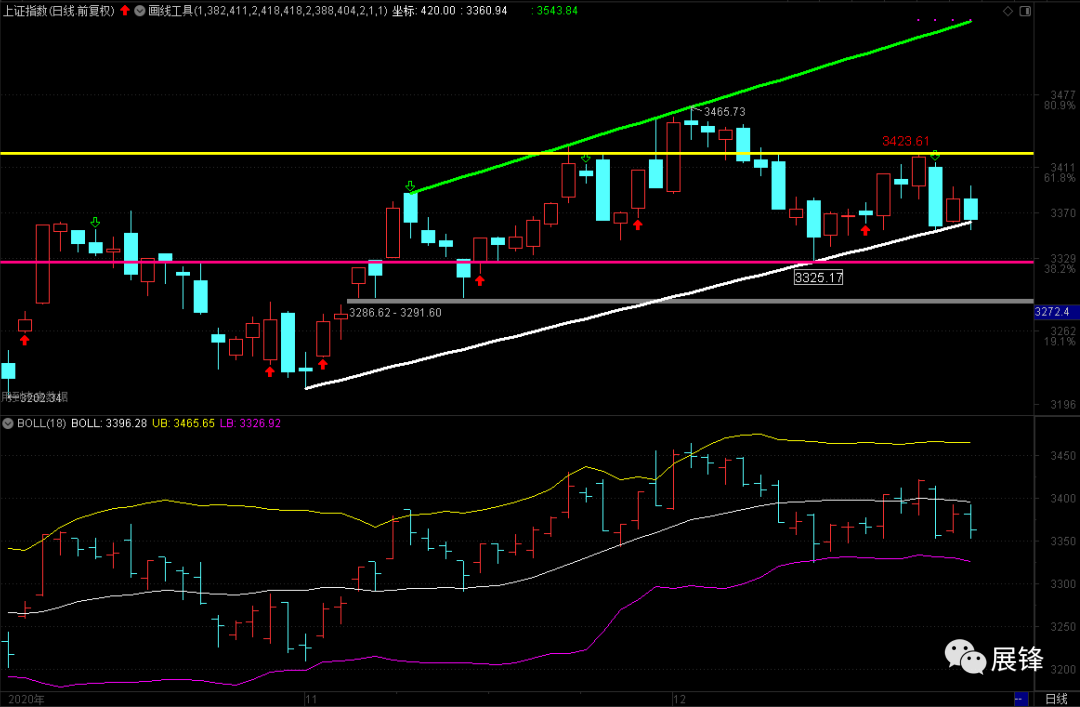 今天大盘最高3394.07,又一次标准的回抽了25日均线,从技术角度而言,这是又一次给了认错的机会。收盘指数勉强站在上升趋势线3360.94之上,为什么会收在关键点位置上呢?你自己想想就知道了!3423.61和3325.17是我们最应该注意的两个点位,因为哪怕是0.01点的上破或下破,都代表着一种真实的态度,如果是你,你该怎么选择呢?