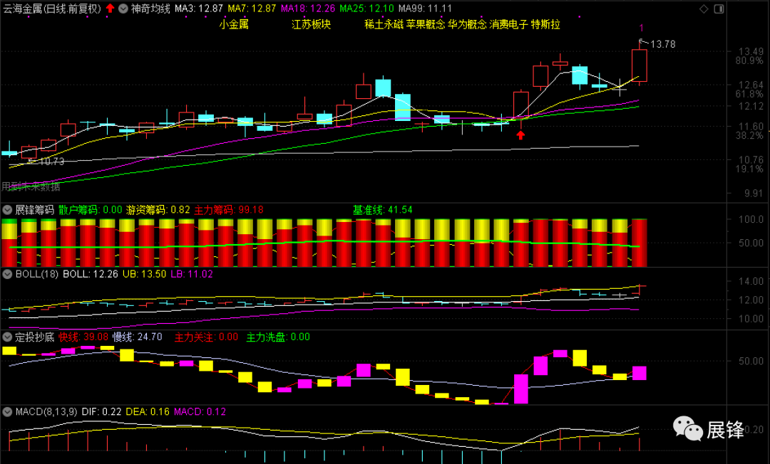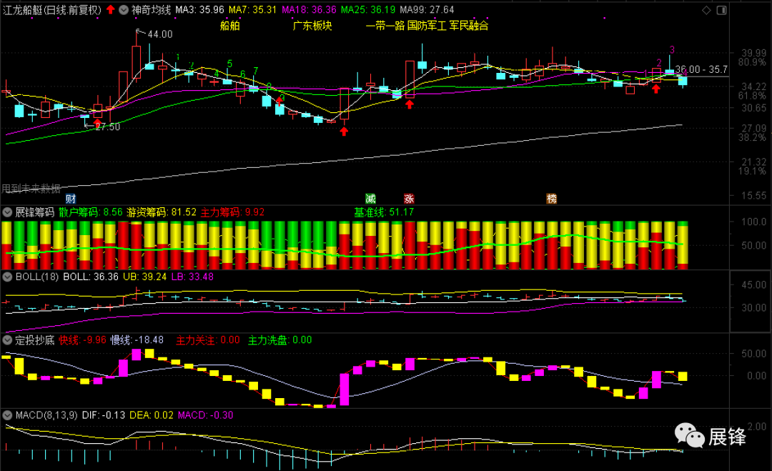早市在33.70元埋伏江龙船艇,结果穿了0.10元没有成交,因为今天开早会的时候我说过,昨天军工股的表现并非空穴来风,随着后市资金的不断涌入,一定会有非常好的机会。所以,后来在34.34元进行了买入,这里就算反抽25或18日线高抛的话,也还是会有不错利润的。因为展锋筹码指标显示,该股散户仅占8.56%,游资的筹码确实大幅增加了!有人说我每天只说涨得好的股票,而不提自己买入后走势不好的。其实,我很怕别人跟进来掉在坑里,毕竟手记只是我个人一个操作的总结,你跟着买了,赚了你自己高兴!一旦出现了亏损的话,就会天天踅摸着损我黑我,不值当的事儿,对于我个人而言,虽然算不了什么,但我也不想因此让任何人受害,内心怎么想的我就会怎么写出来,你爱信不信!