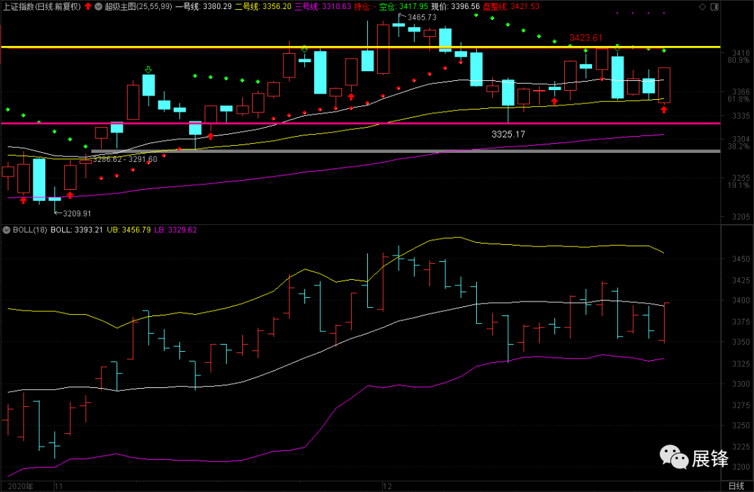 说实话,我也希望出现大阳突破的走势。毕竟2020年就剩最后4个交易日了,下周一多空转换点3417.95,3423.61是一个做多标志点,如果不能够有效突过去的话,该放还是要防的。我这个人做事喜欢把丑话说在前面,也不想掺杂任何虚假的所谓几浪几浪的瞎猜,走出来就代表一种态度,没有走出来之前就是混沌一片,你记住这就是A股!