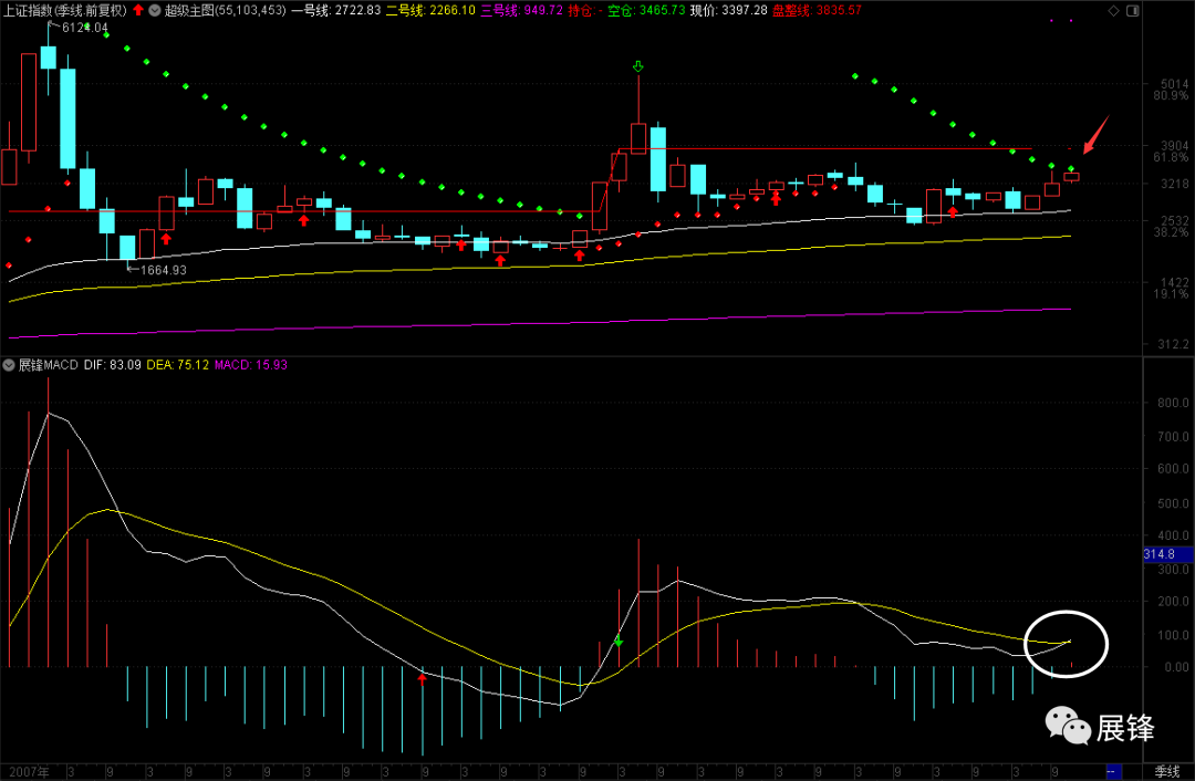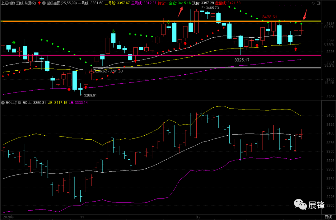 今天市场最高冲到3412.52,没有突破多空转换点3417.95,更别谈对3423.61的突破。明天主板日线多空转换点在3415.16,重要压力依旧是3423.61,这两个位置构成了一个压力带。就算能够由空翻多,突破不了3423.61的话,也不过是白白浪费时间。其实,现在突破与否都不重要,因为在大格局角度下,今年基本上就已经定局了!