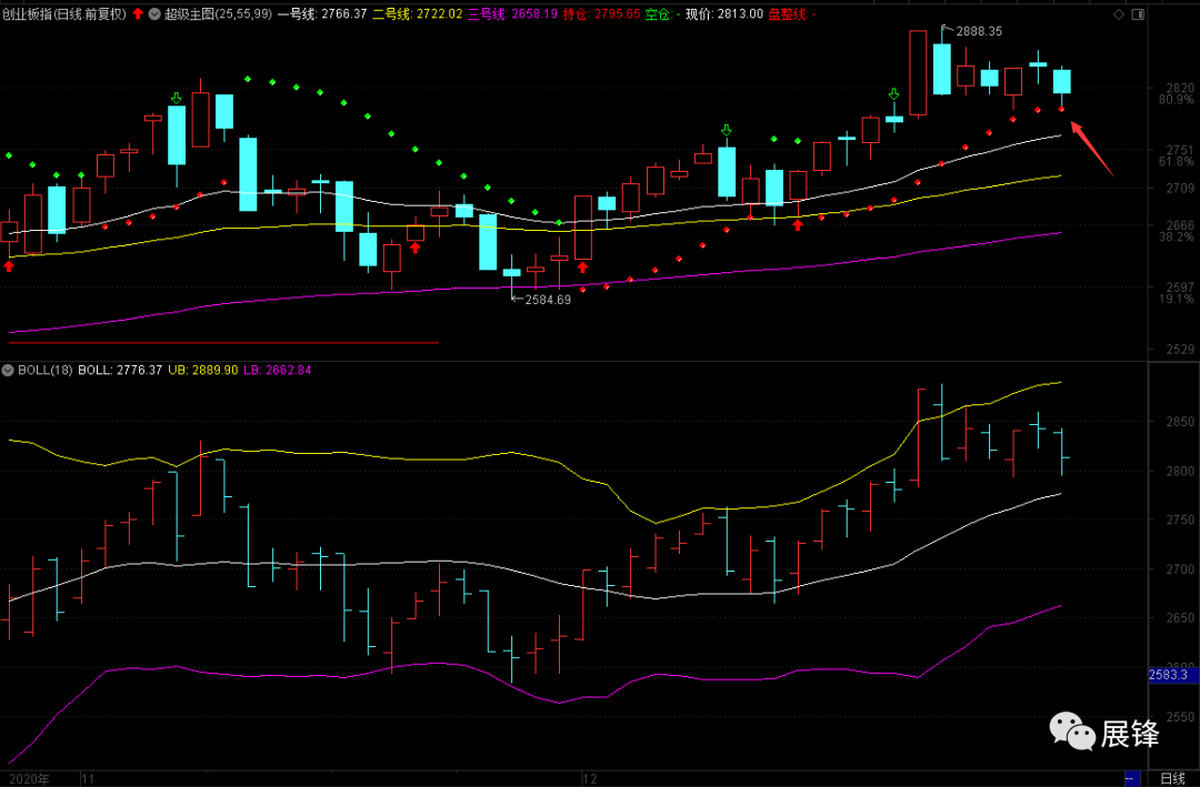 创业板今天分化的比较厉害,从即时图上就可以看得出来,黄线在上,白线在下,说明中小盘个股走的比成分股要好,明天多空转换点在2795.65,也就是今天的最低点这里,不能破哪怕0.01个点,否则创业板日线将由多翻空。此外,日线布林线中轨呈现缓慢上移态势,如果回踩不破的话,就仍然有机会再去攻击布林线上轨,否则短时的创业板也将会再度走弱!