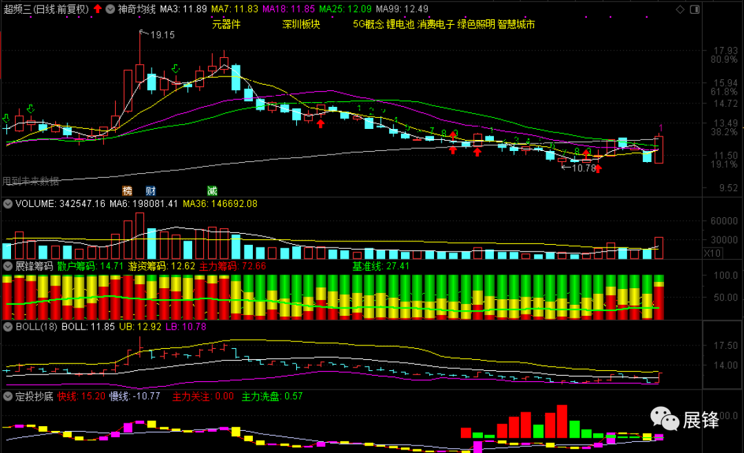 超频三是今天我自选股中,涨得最好的一只个股。一阳收复了18、25和99日均线,成交量水平也非常不错。从日线展锋筹码指标来看,今天主力筹码72.66,卖出的是游资和散户筹码,而且收盘在近高12.47元之上,接下来如果可以持续性的放量上行的话,那么该股涨停基因可能将被再度激活,那样的话看到16.09元或许问题不大。