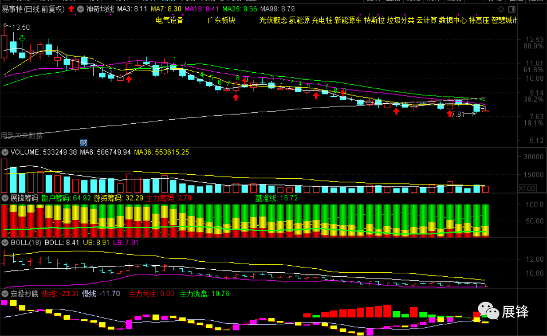 氮化镓龙头易事特,今天表现的非常一般,没有走出应有的气势,特别是成交量水平没有跟上,致使6日均量上穿36日均量的气势没有生发出来。所以,我昨天加仓的部分也没有卖出,该股布林线已经极度收口,看看下一交易日有没有一个大的表现,至少反抽中轨或25日线,才能够多多少少打出一些气势来!今天就写到这里,稍后记得去一直播听课!