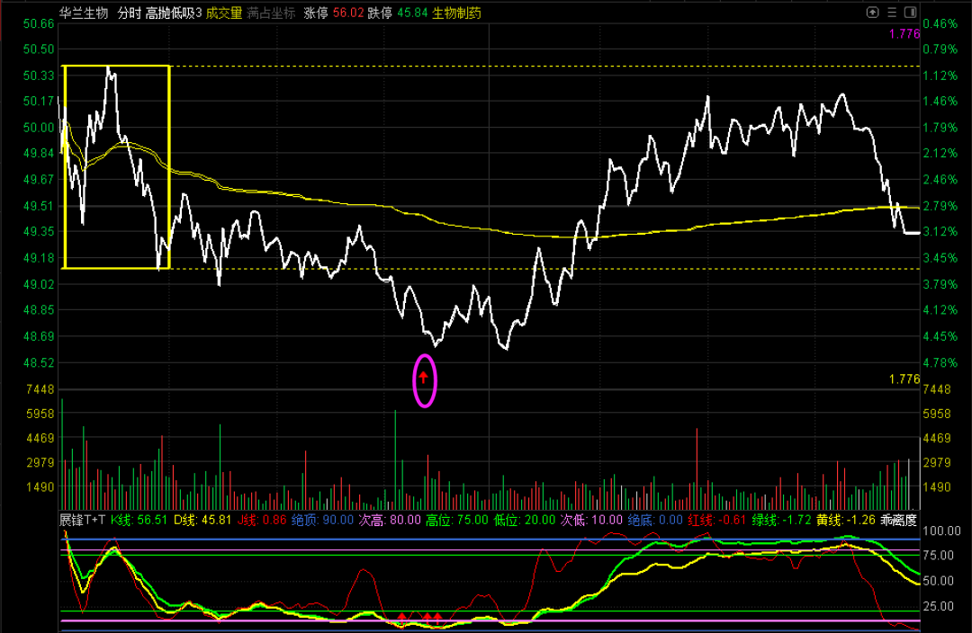 由于上午有事情要处理,华兰生物措施为一个买入的好点。这个红箭头信号的低买价格48.70元,按1.025出局高抛计算,最差的数据价格也是49.92元。不过我比较欣慰,有的软件用户做到了这个一块多钱的盘中T,我没做到是我个人的问题,后面我会更加认真珍视每一个信号,争取早日将华兰生物的持仓成本T下去!