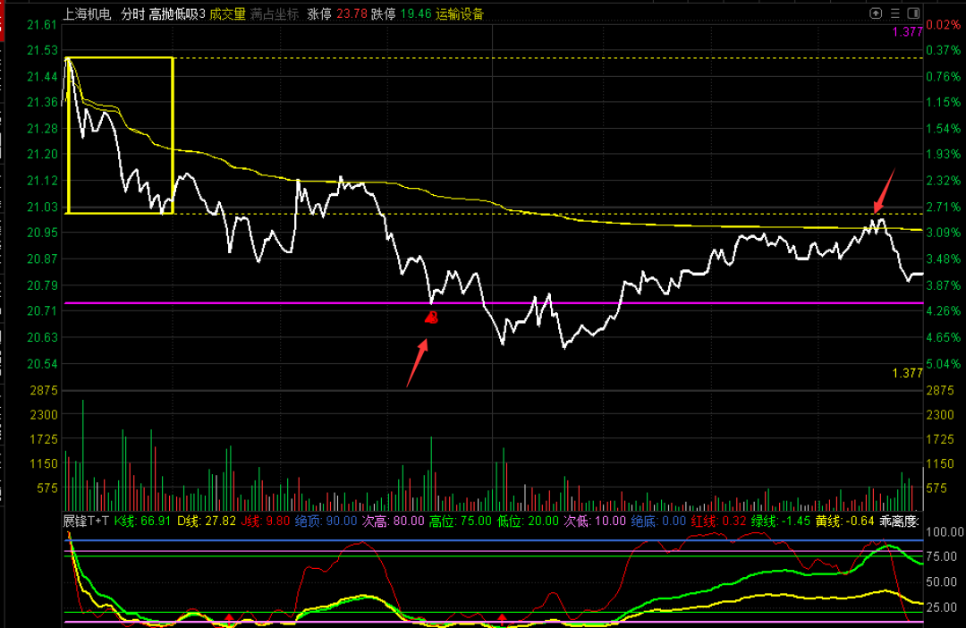 今天在20.74元买入上海机电做盘中T,尾盘该股拉升力度很有限,就在20.98元做了高抛,由于是盘中做T,所以千万不要留股过夜,除非是有特别大的把握,否则千万不能违背了高抛低吸的原则。在这以后的讲课中,我会着重的讲到。不能够实现盘中做T时,切不可强行买入。因为有些时候进行强行买入,会招来不必要的损失!