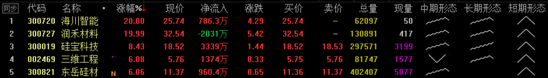 今天我自选股里表现最好的5只个股,海川智能首当其冲,润禾材料的涨停板,是带动硅宝科技和东岳硅材上涨的最主要原因。如果接下来润禾材料继续表现的话,那接下来这两只个股跟随的概率更大。能不能超越暂不可知,经过一轮大的下跌之后,如果可以顺利企稳的话,那短期上扬的概率还是蛮大的,就看主力怎么理解了。